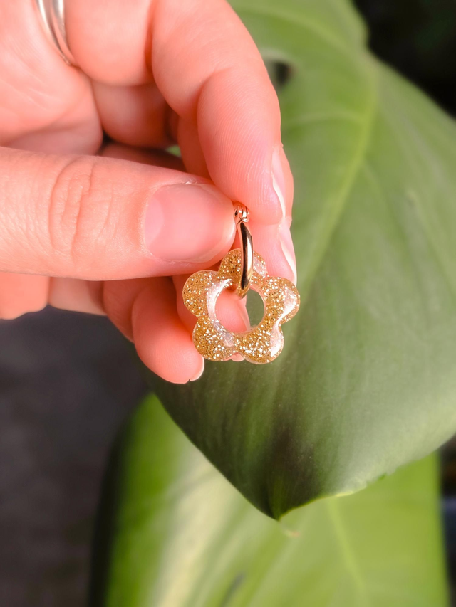 Matière : Résine pailletée, montées sur créole dorée (acier inoxydable)